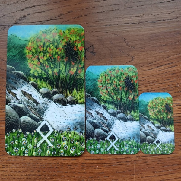 Tavaline suuru – 6 × 8 cm. See klassikaline mõõt sobib igapäevaseks kasutamiseks nii kodus kui teraapiliseks otstarbeks. Kaardid on piisavalt suured, et nautida iga illustratsiooni detaili ja sümboli energiat. Sobib hästi ruunide ladumiseks ja sügavaks analüüsiks.