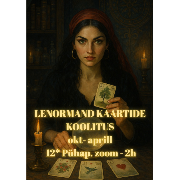Lenormand kaartide algajate kursus (online, Zoom) on loodud selleks, et anda igale osalejale kindel alus kaartide iseseisvaks tõlgendamiseks. Kursuse eesmärk on arendada intuitiivset mõtlemist, õpetada kaarte süsteemselt lugema ning näidata, kuidas neid igapäevases elus ja otsuste tegemisel kasutada.