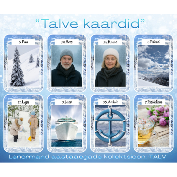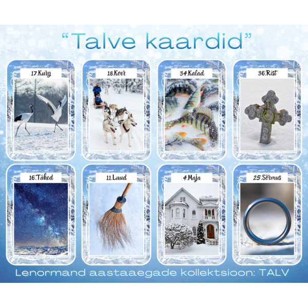 „Talve kaardid“ on osa Lenormand “aastaaegade kollektsioonist”, mis sisaldab nelja erinevat pakki (kevadsuvi–sügis–talv). Hooajad vahetuvad ja kollektsioon täieneb – hoia meie lehel silm peal.